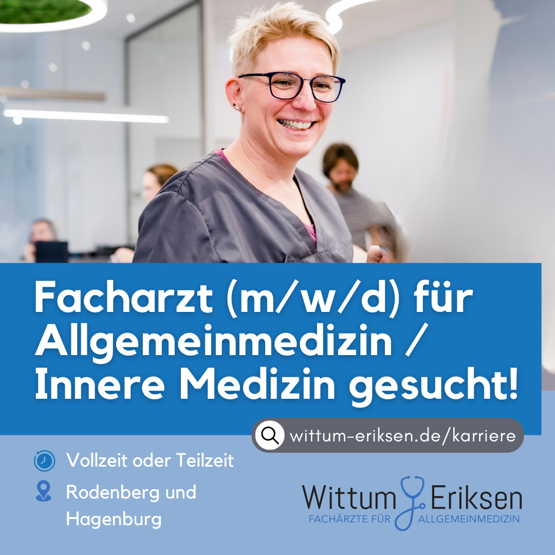 4.Gerade Fachärzte für Allgemeinmedizin wissen die Konstruktion von Wittum & Eriksen zu schätzen: Wir unterhalten derzeit neun Praxen unter dem Dach eines Medizinischen Versorgungszentrums. Diese zeitgemäße Konstruktion garantiert unseren Ärzten ein Maximum an Flexibilität, vor allem was die Arbeitszeit betrifft. Vollzeit? Teilzeit? Gemeinsam finden wir das Modell, das haargenau zu Ihren Bedürfnissen passt.