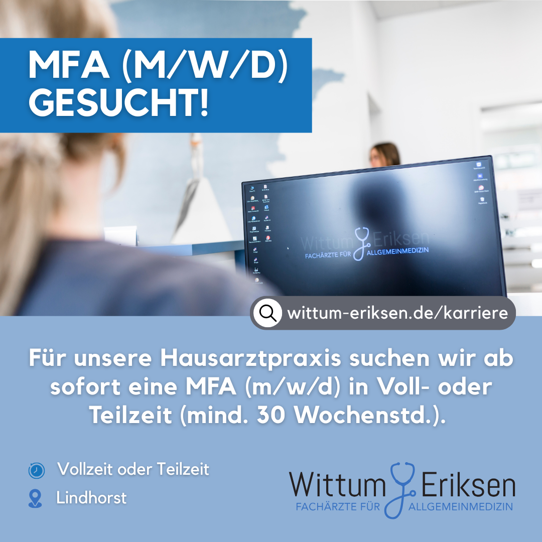 6.Selbständige Ärzte leben heutzutage mit einem hohen Haftungsrisiko. Dieses Risiko verringert sich erheblich, wenn Sie unter dem Dach eines Medizinischen Versorgungszentrums wie Wittum & Eriksen arbeiten. Diese Dinge übernehmen wir gern für die Ärzte, die bei uns angestellt sind. Sie können sich darauf konzentrieren, das zu tun, wofür Sie den Beruf des Allgemeinmediziners ergriffen haben – Menschen gesund zu machen und gesund zu erhalten. Nach Dienstschluss können Sie unbelastet Familie und Freizeit genießen. Wir, Henrike Wittum und Thomas Eriksen, freuen uns auf Sie! Ihre Bewerbungen (gern auch Initiativ-Bewerbungen) richten Sie bitte an karriere@wittum-eriksen.de. Nachfragen beantworten wir Ihnen unter Tel.: 05724 – 69 47. Unter der angegebenen E-Mail-Adresse können Sie sich für Praxen bewerben, die zur Wittum & Eriksen PartG mbB und zur Wittum & Eriksen MVZ GmbH zählen.